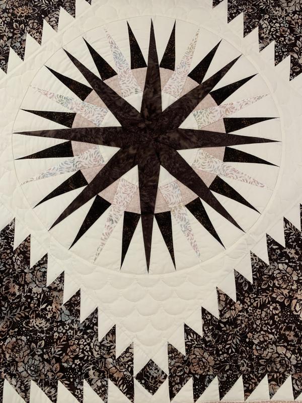 A stunning Mariner's Compass Star creates a center medallion of this handsome quilt. Various borders, including a saw-tooth one flank the central star.