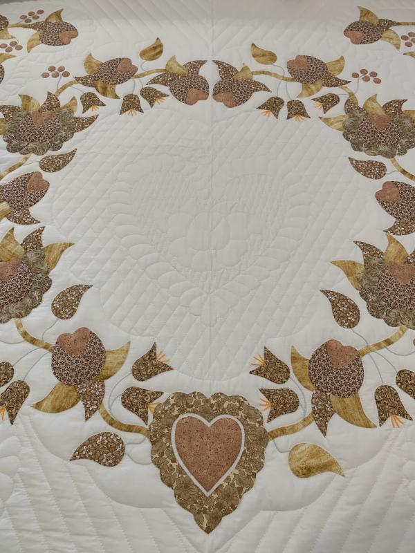 A beautiful romantic quilt design, the Heart of Roses quilt features hand-appliqued roses, leaves and berries in a pleasing heart-shaped arrangement. The quilting in this design is always extensive, especially in the center of the heart. Hand-quilted by a friend, Lancaster County, PA.