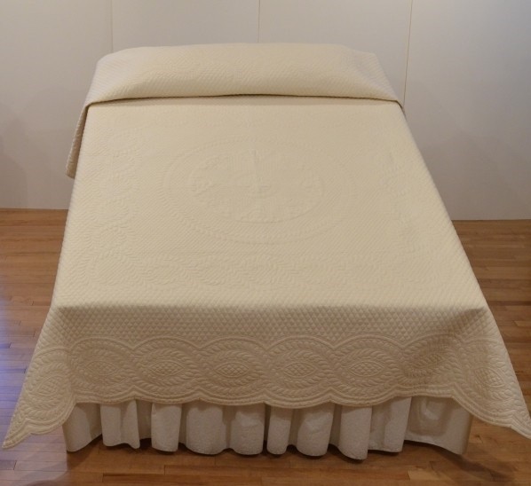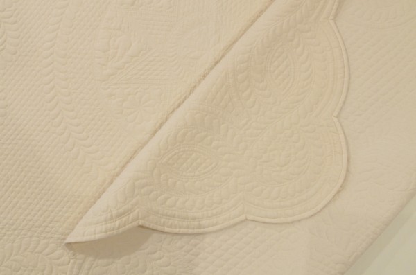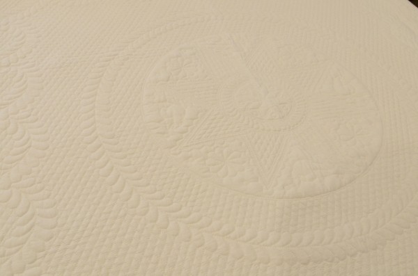 Nothing showcases hand-quilting like an Heirloom quilt! Study the intricate quilting designs, including extensive cross-hatching, lovebirds (can you find them?), and flowing feather-stitching. A whole-cloth quilt is an heirloom, indeed! Hand-quilted by an Amish friend, Lancaster County, PA.