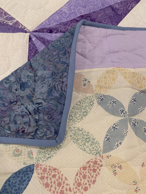 This quilt pattern is an original design. The quilter showcases her expert mastery of color in this beautiful quilt! Hand-quilted by a Mennonite friend, Lancaster County, PA.