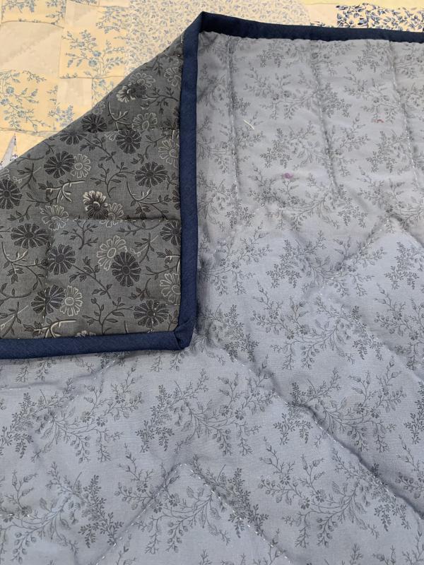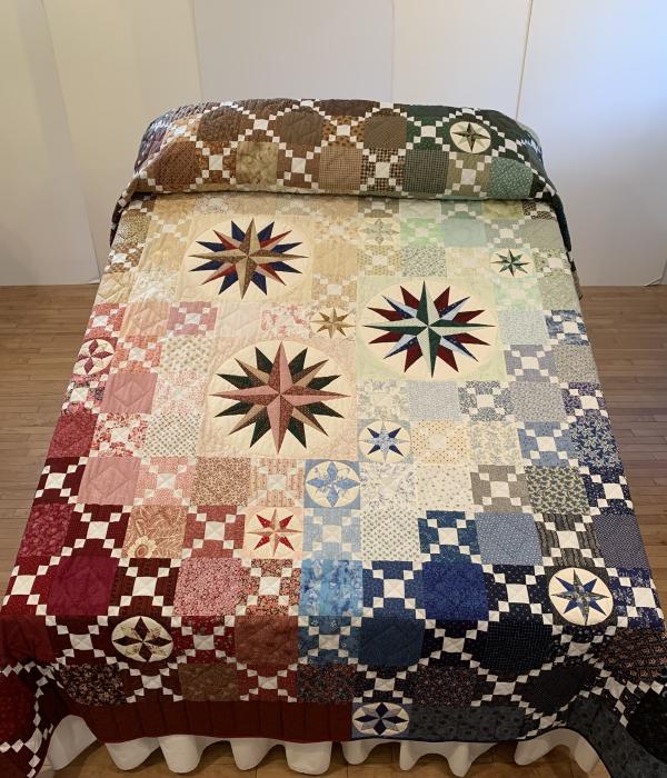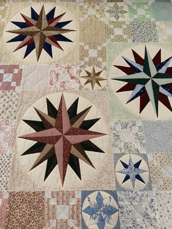 This quilt is a beautiful display of the quilter's expert eye in color and shading. Notice how the stars of the compasses practically glow! Hand-quilted by a Mennonite friend, Lancaster County, PA.