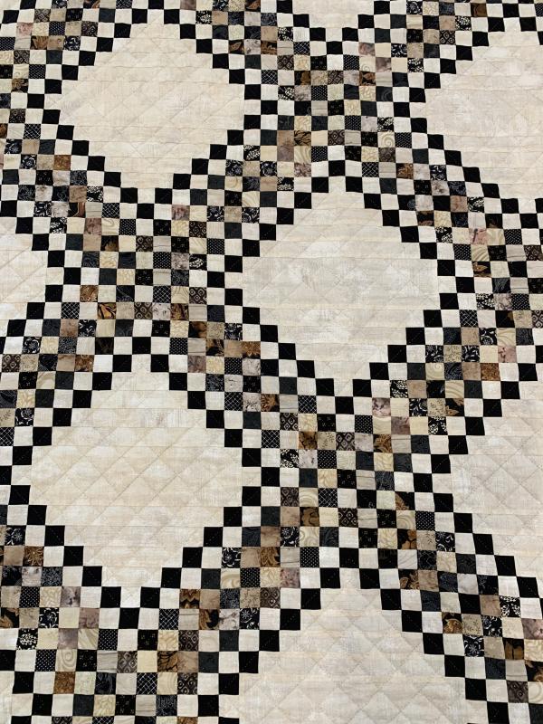 A combination of two beloved patterns, thousands of small postage stamp-sized pieces all work together in this Irish Chain design known for its simplicity and airy quality! The quilt-maker's artful placement of color creates a visually pleasing design. Precise piecing and intricate hand-quilting make this quilt a stunning heirloom. Hand-quilted by a Mennonite friend, Lancaster County, PA.