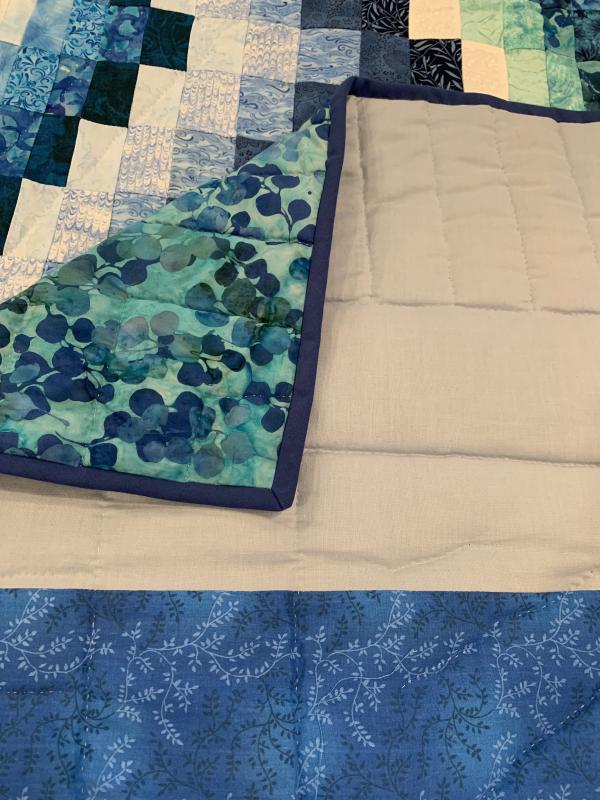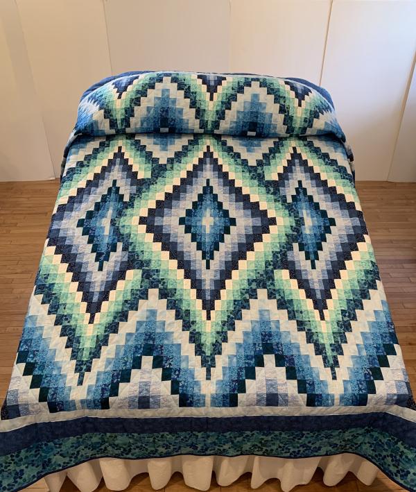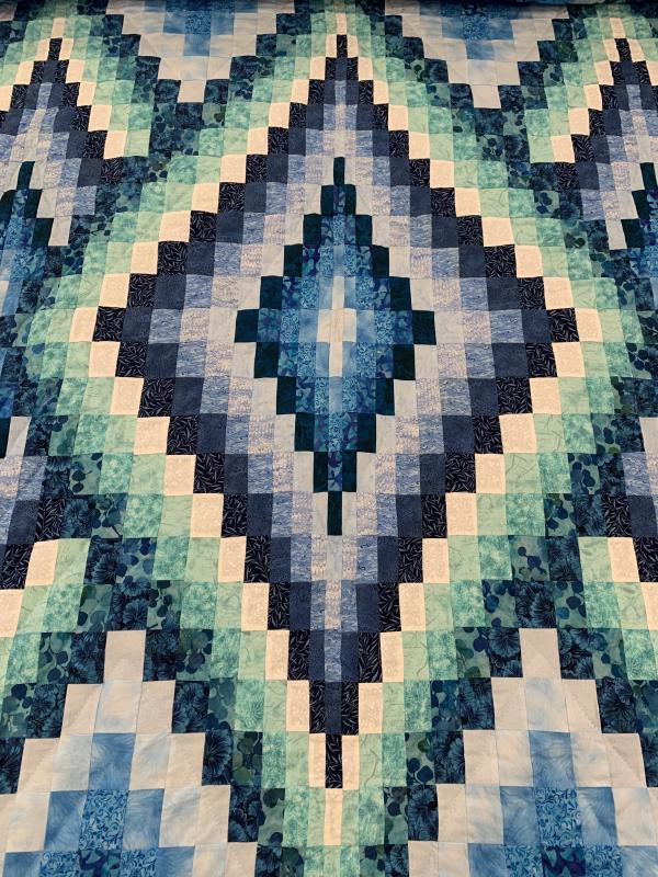 Wow, what an interesting variation of the Bargello pattern! This is definitely the work of an experienced quilter who has great organizational skills! The shifting color values bring energy and excitement. Hand-quilting from corner-to-corner of each block enhances the design. Hand-quilted by a Mennonite friend, Lancaster County, PA.