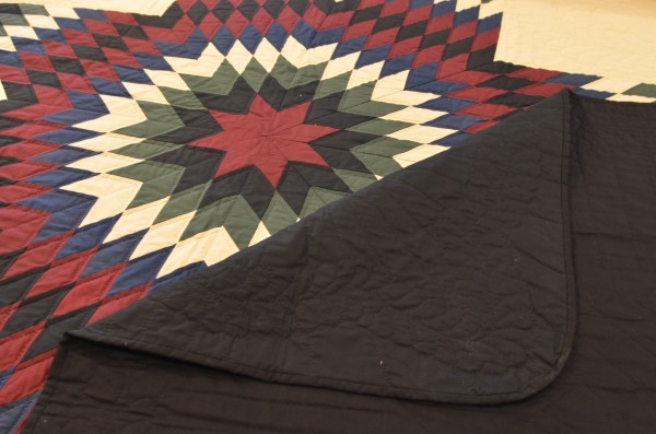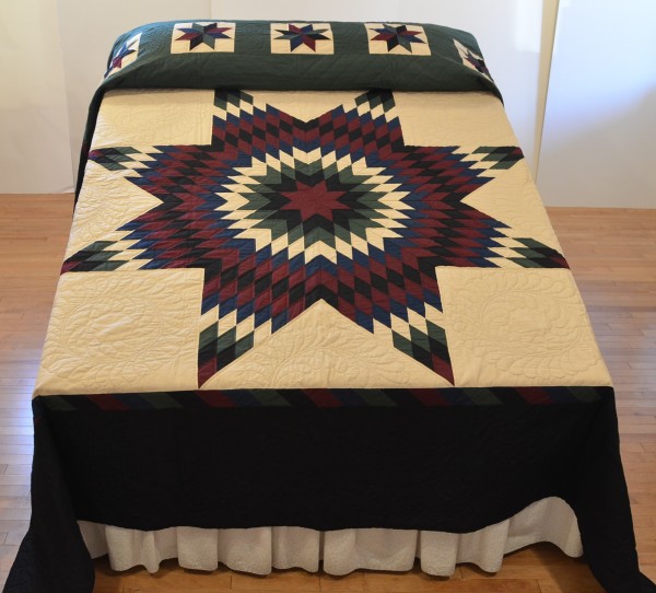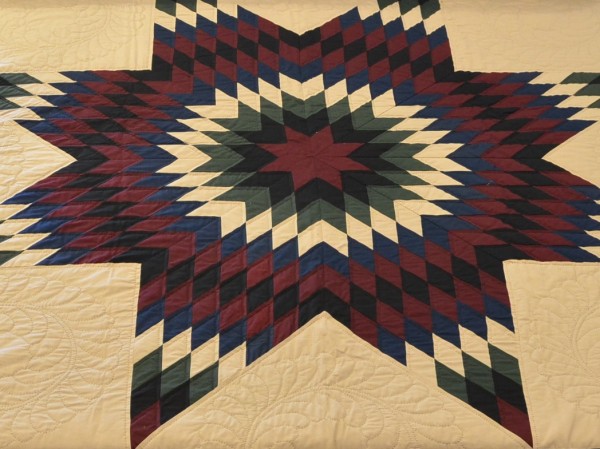 The Lone Star is a classic pattern that appeals to many buyers! It requires careful piecing for the diamonds to align perfectly and the center of the quilt to lay flat.