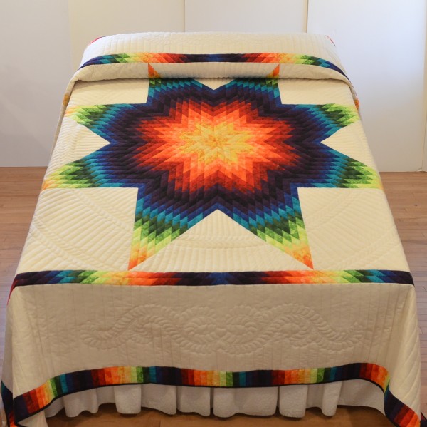 The Lone Star is a classic pattern that appeals to many buyers! It requires careful piecing for the diamonds to align perfectly and the center of the quilt to lay flat.