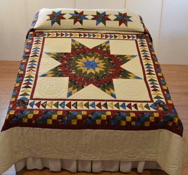 Here’s an attractive variation of the Lone Star quilt design. This smaller star is contained within a Flying Geese border and a pieced block border.