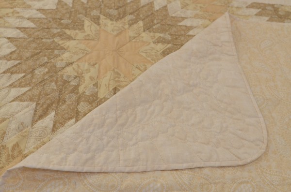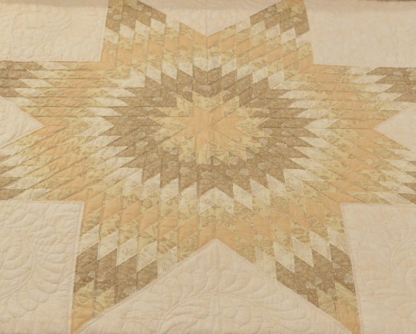 The Lone Star is a classic pattern that appeals to many buyers! It requires careful piecing for the diamonds to align perfectly and the center of the quilt to lay flat.