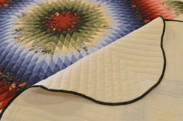 The Lone Star is a classic pattern that appeals to many buyers! It requires careful piecing for the diamonds to align perfectly and the center of the quilt to lay flat.
