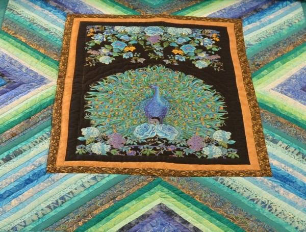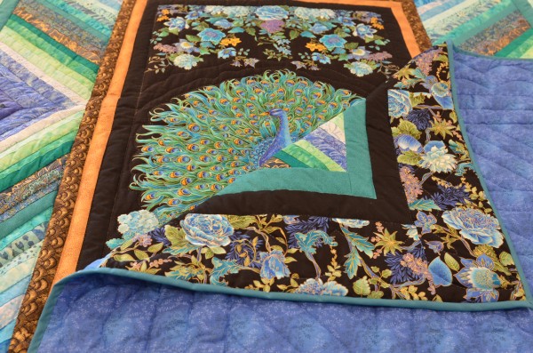 Featuring a beautiful peacock panel with metallic gold accents, this quilt is a one-of-a-kind design from a local Old Order Mennonite quilter. Notice how she chose her accent colors, arranged in diagonal stripes, to compliment the outer border and peacock panel.