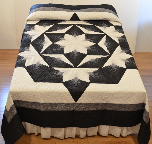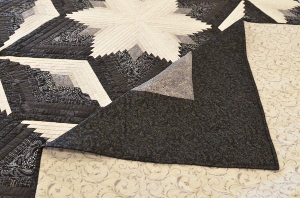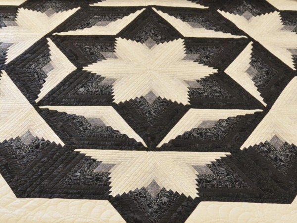 Diamond-shaped Log Cabin blocks are the basis for this spectacular star-themed quilt. Each diamond is meticulously pieced with strips of two colors in varying shades, resulting in a dimensional star.
