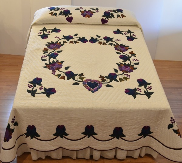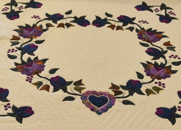 A beautiful romantic quilt design, the Heart of Roses quilt features hand-appliqued roses, leaves and berries in a pleasing heart-shaped arrangement.