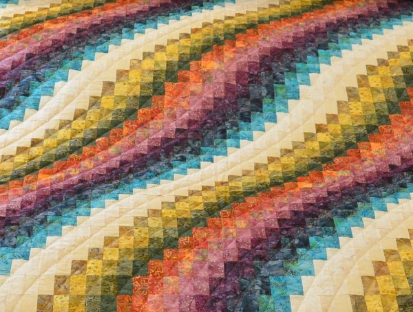 The more than 2,000 blocks are hand-quilted across the diagonal, enhancing the movement of the piece.