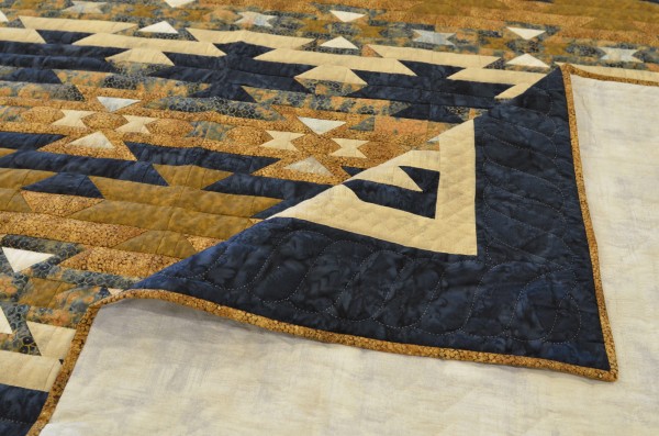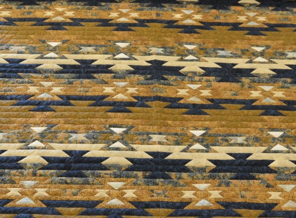 Featuring 12” blocks, each comprised of 76 pieces, the Painted Desert is a piecing work of art. The hand-quilting is dense and adds value to this one-of-a-kind quilt.