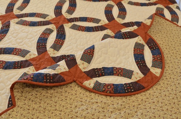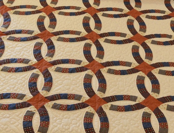 The intertwining circles created from curved pieces of fabric require a skilled seamstress, and the intricate hand-quilting exemplifies outstanding workmanship.