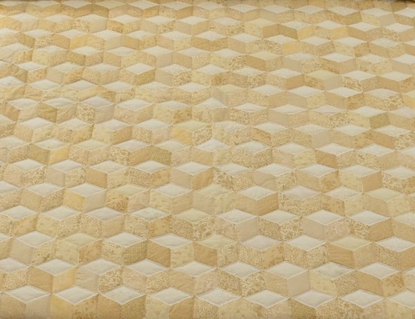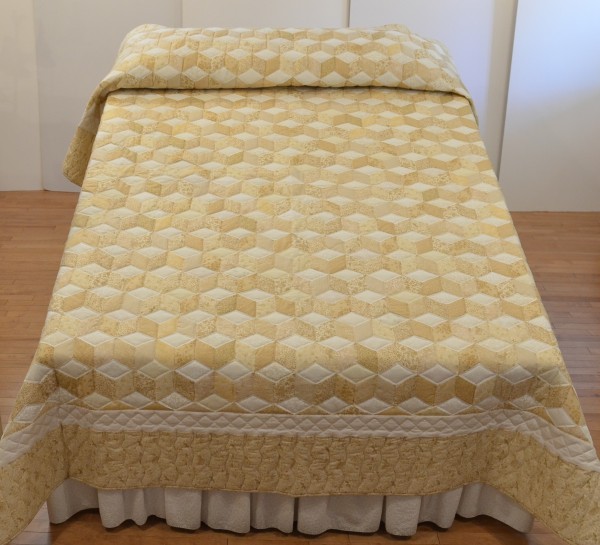 The expert shading in this quilt creates a 3-dimensional effect and the illusion of blocks falling across the bed. The Tumbling Block pattern can only be done well by an experienced seamstress, and the piecing of this traditional design is very precise.