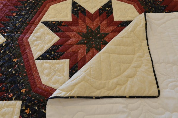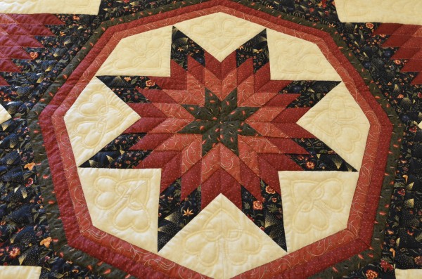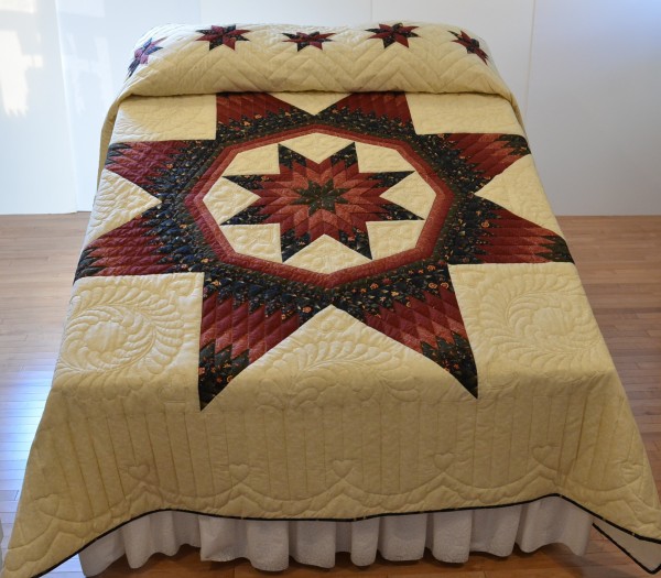 A star within a star makes a striking and handsome quilt! And stars across the pillow portion of the quilt are a fitting detail. The rest of the quilt’s charm is the generous amount of hand-quilting which accents the strength of the medallion star.