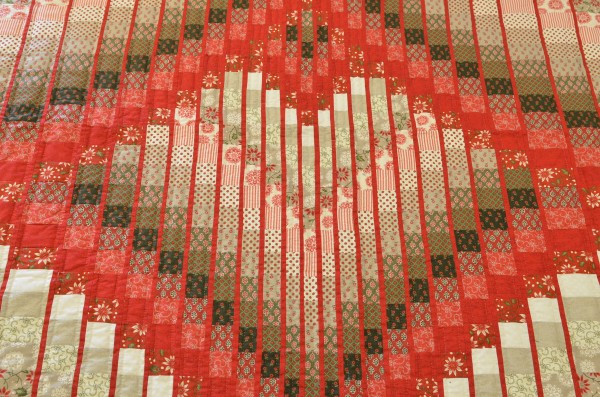Waves of color seem to skip around the quilt in a random fashion, and thin stripes of color break the shifting waves.