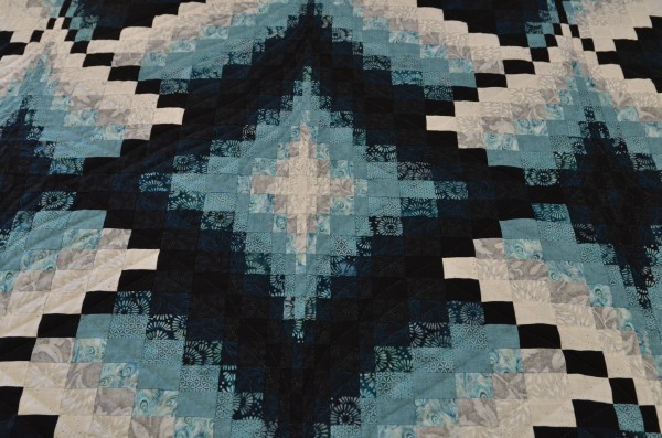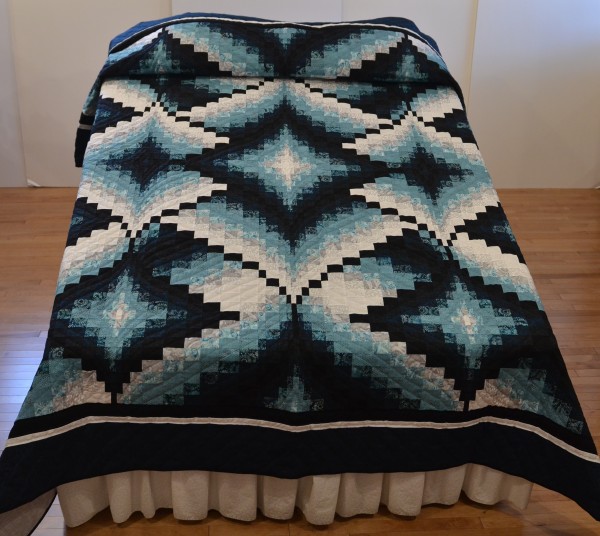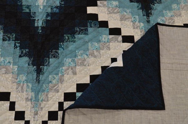 The shifting color values bring energy and excitement. Hand-quilting from corner-to-corner of each block enhances the design.