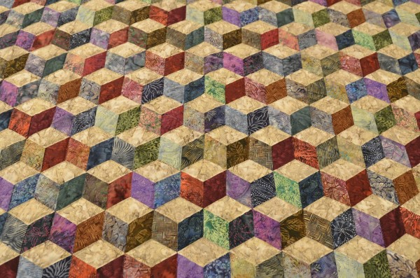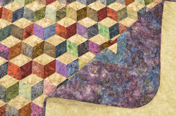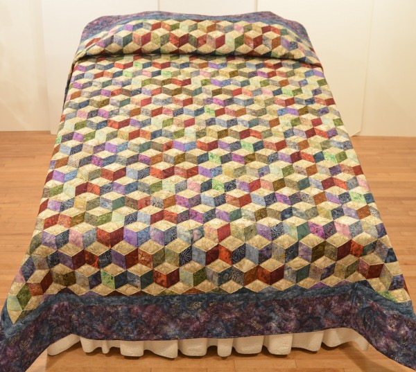 The expert shading in this quilt creates a 3-dimensional effect and the illusion of blocks falling across the bed. The Tumbling Block pattern can only be done well by an experienced seamstress, and the piecing of this traditional design is very precise.