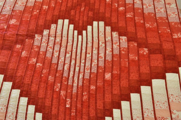 Waves of color seem to skip around the quilt in a random fashion, and thin stripes of color break the shifting waves.