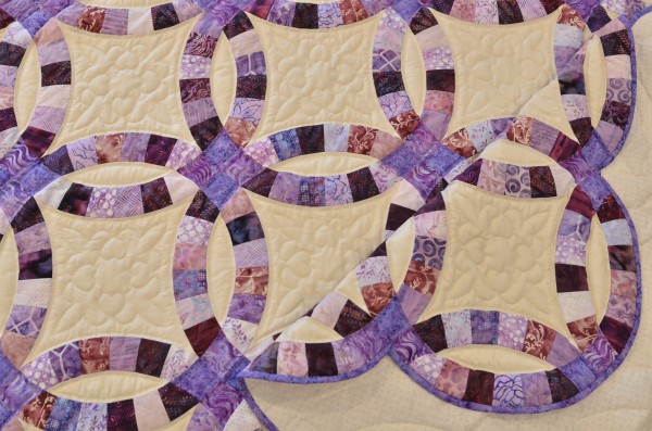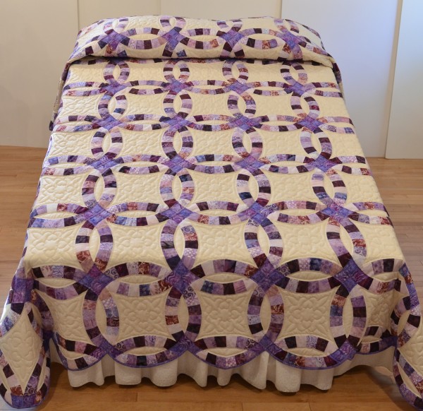 The intertwining circles created from curved pieces of fabric require a skilled seamstress, and the intricate hand-quilting exemplifies outstanding workmanship.