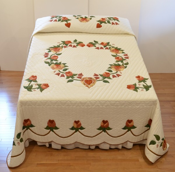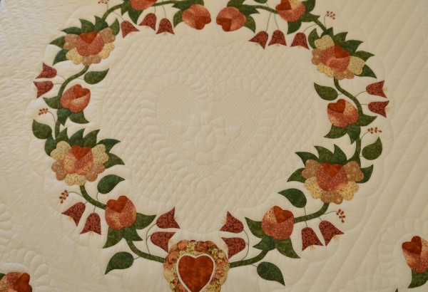 A beautiful romantic quilt design, the Heart of Roses quilt features hand-appliqued roses, leaves and berries in a pleasing heart-shaped arrangement.