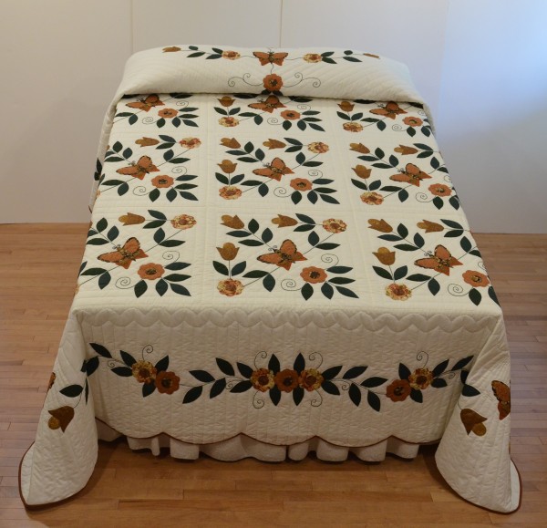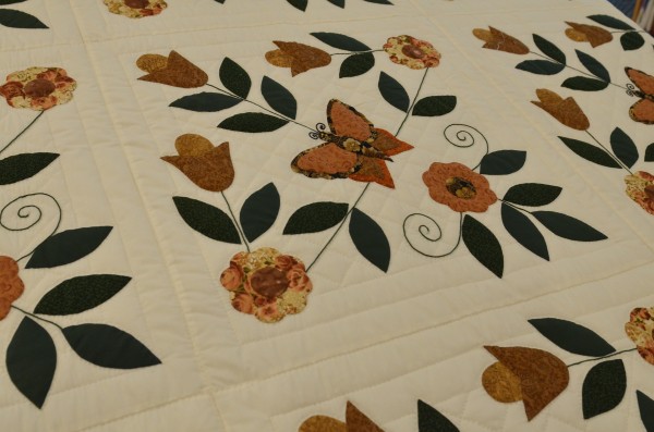 There are many, many hours of handwork on this applique quilt. Each of the butterflies, leaves, and flowers was sewn on by hand. The quilting was also done by hand.