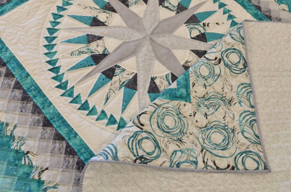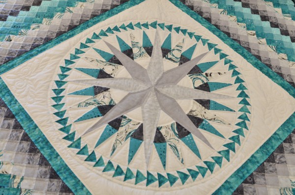 There are three popular quilt patterns in this lesser-known gem. In the center find the Mariner’s Compass star which is encased in a ring of Flying Geese triangles. The quilt’s center block is surrounded by a Trip Around the World block arrangement.