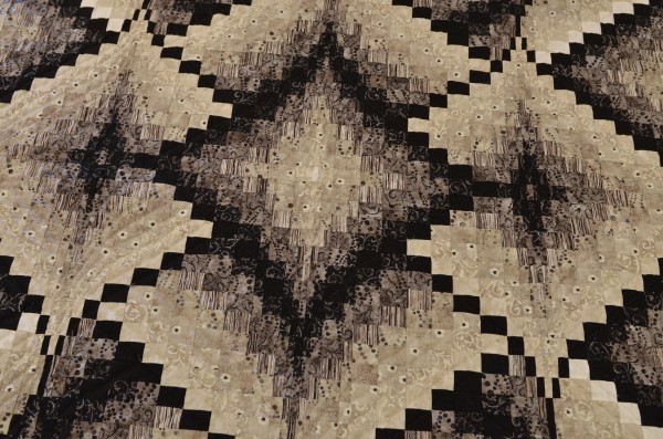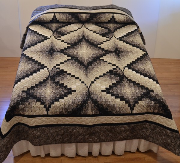 Diamonds on point, each comprised of two fabrics, make up the Diamond Jubilee design. The pattern resembles a basket weave and is flanked by a wide border around the perimeter. Hand-quilted by an Amish friend, Lancaster County, PA.