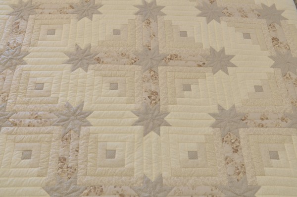 A popular variation of the traditional Log Cabin quilt pattern, this quilt boasts eight-pointed stars at the block intersections.