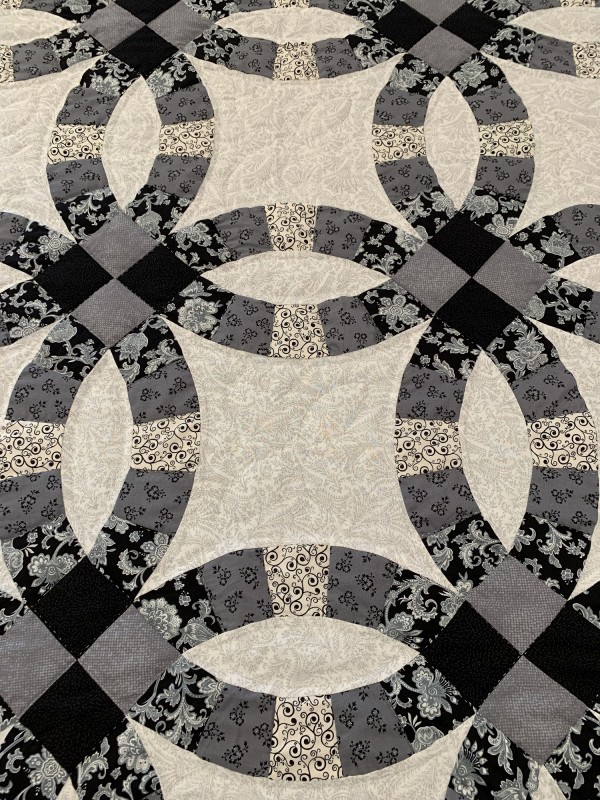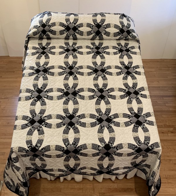 The intertwining circles created from curved pieces of fabric require a skilled seamstress, and the intricate hand-quilting exemplifies outstanding workmanship.