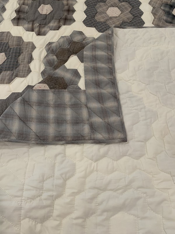 One can easily see how this traditional pattern got its name! The blocks create a flower pattern--Grandmother's Flower Garden! Shaded color values enhance the design, and sashing and borders help frame everything inside this handsome quilt. Hand-quilted by a friend, Lancaster County, PA.