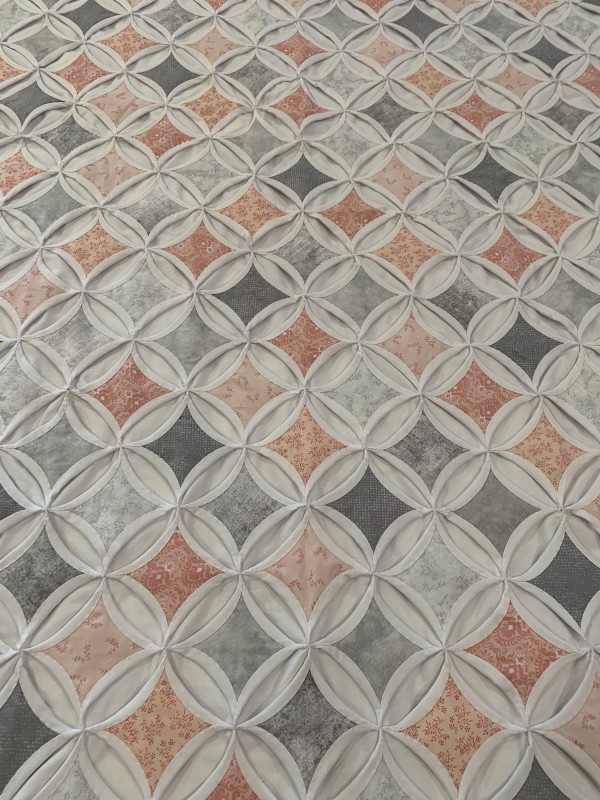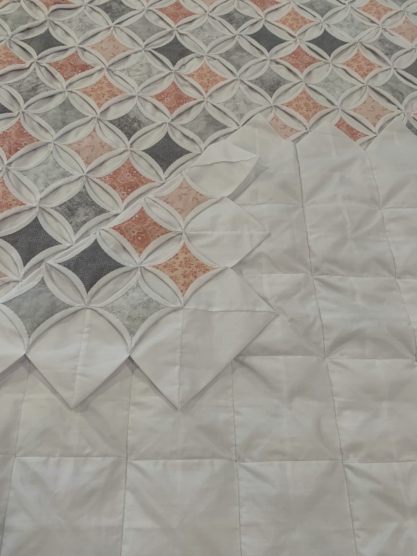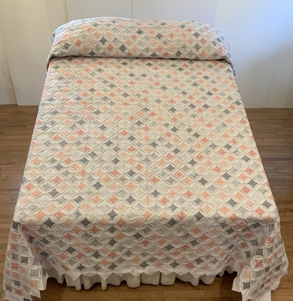 The Cathedral Window pattern is a very old one that’s quite labor-intensive. Each colored panel in this quilt has been hand-sewn in place and carefully arranged in a precise pattern. While there's no batting filler between the layers, the 30-plus yards of muslin fabric add substantial weight and body to the quilt. Notice the saw-tooth edge around all four sides of the quilt. Hand-sewn by a friend, Lancaster County, PA. Please note, this quilt fits nicely on both a King and Queen sized bed.