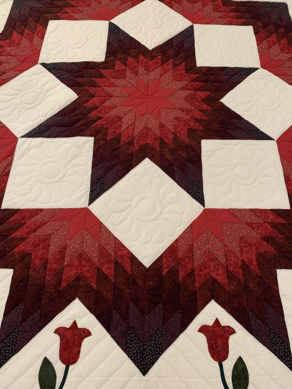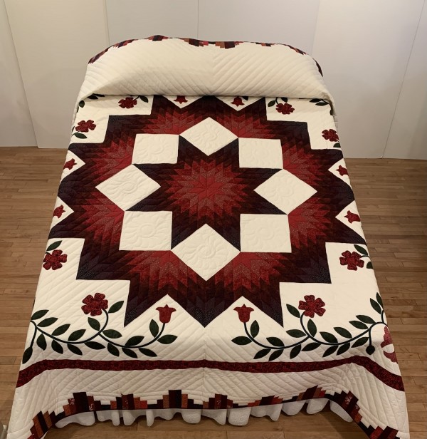 The star seems to have a 3-dimensional quality to it just because of the placement of the colors. Set against the ivory background, the star sings! We love this variation of the Lone Star pattern. Additionally, this quilt features appliqued flowers surrounding the star. Stunning!