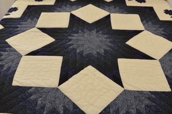 The star seems to have a 3-dimensional quality to it just because of the placement of the colors. Set against the ivory background, the star sings! We love this variation of the Lone Star pattern. Additionally, this quilt features appliqued flowers surrounding the star. Stunning!