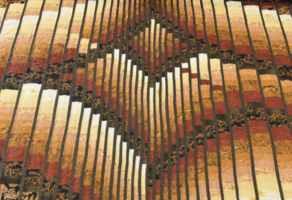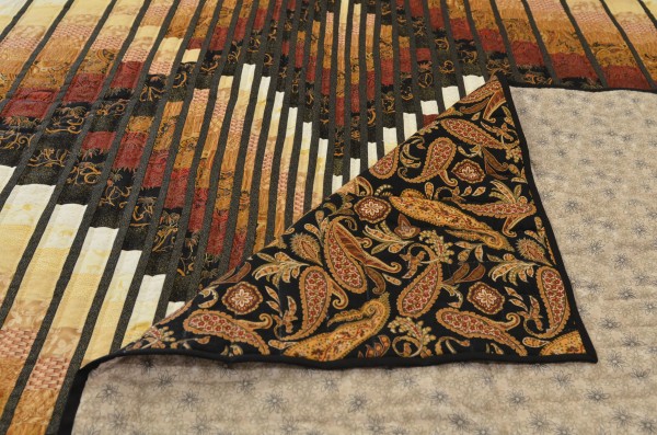 Waves of color seem to skip around the quilt in a random fashion, and thin stripes of color break the shifting waves.