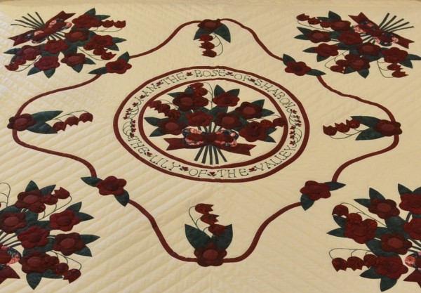 The center medallion features hand-embroidered text “I am the Rose of Sharon; the Lily of the Valley,” and the sides and bottom are accented with applique swags and flowers.