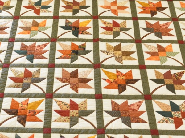Each leaf is composed of eight pieced sections and multiple fabrics, making this a well-designed scrap quilt.