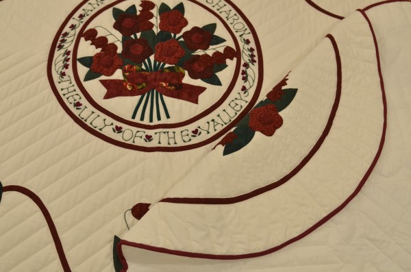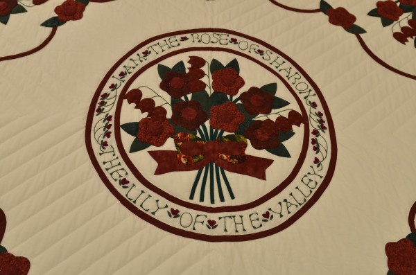 The center medallion features hand-embroidered text “I am the Rose of Sharon; the Lily of the Valley,” and the sides and bottom are accented with applique swags and flowers.