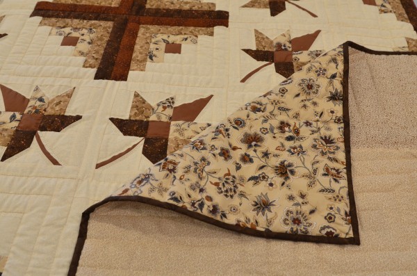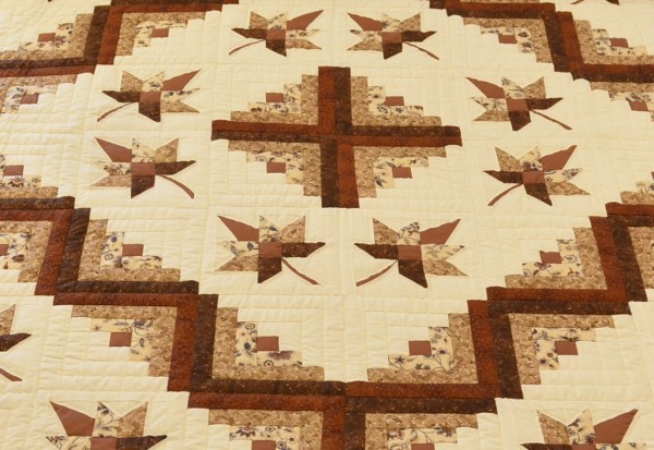 Gently falling maple leaves have drifted onto the familiar Log Cabin design, creating a pleasing, new variation to the traditional Log Cabin quilt. Notice how each Maple Leaf block is carefully placed with points strategically encircling the diagonal stripes of the overall design. Lovely!