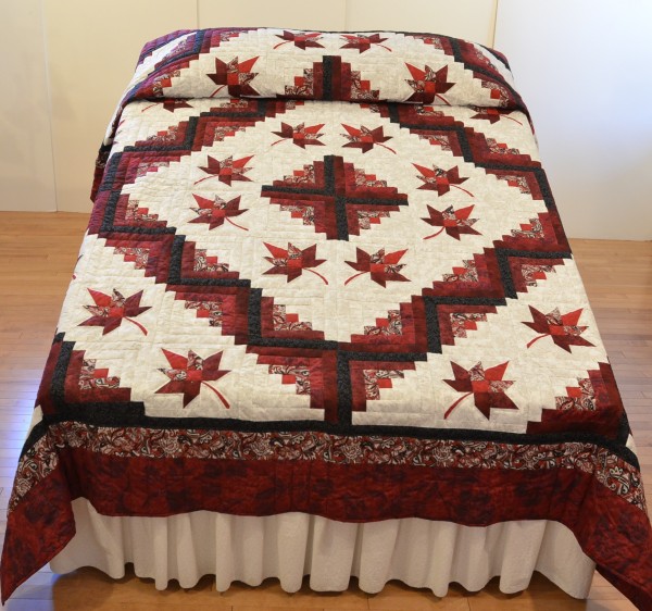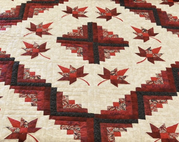 Gently falling maple leaves have drifted onto the familiar Log Cabin design, creating a pleasing, new variation to the traditional Log Cabin quilt. Notice how each Maple Leaf block is carefully placed with points strategically encircling the diagonal stripes of the overall design. Lovely!
