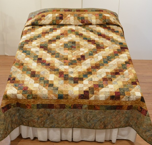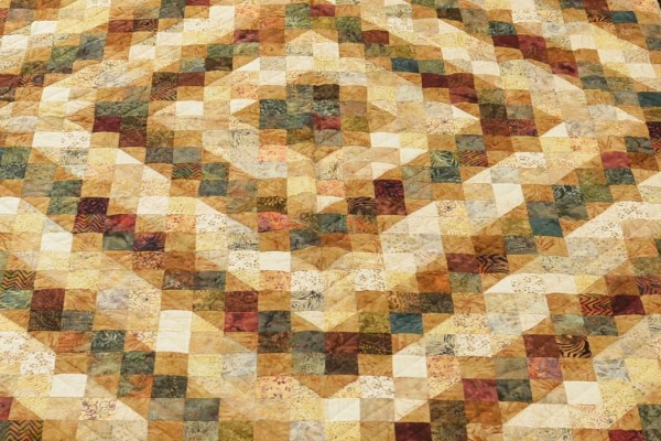 A variation on the traditional Nine Patch pattern, this design uses geometry and color placement to create a striking artistry. Fine workmanship is exemplified in the delicate piecing required to match many corners while piecing countless small squares.