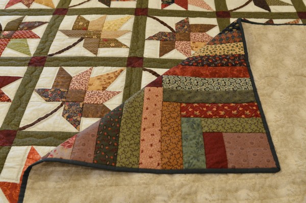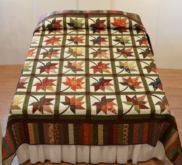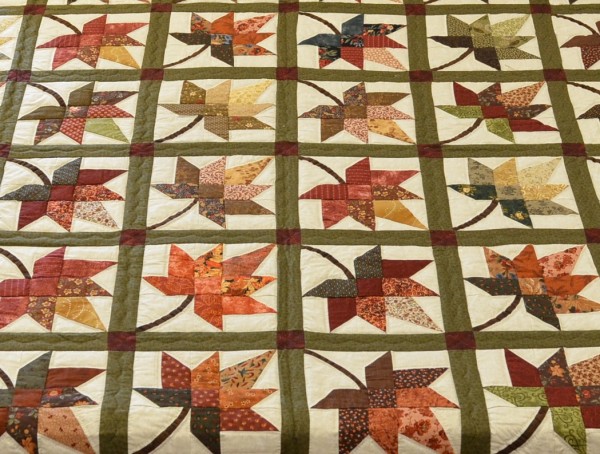Each leaf is composed of eight pieced sections and multiple fabrics, making this a well-designed scrap quilt.