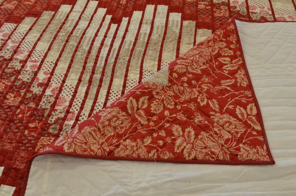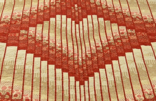 Waves of color seem to skip around the quilt in a random fashion, and thin stripes of color break the shifting waves.