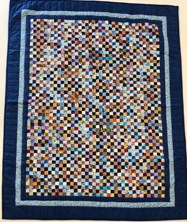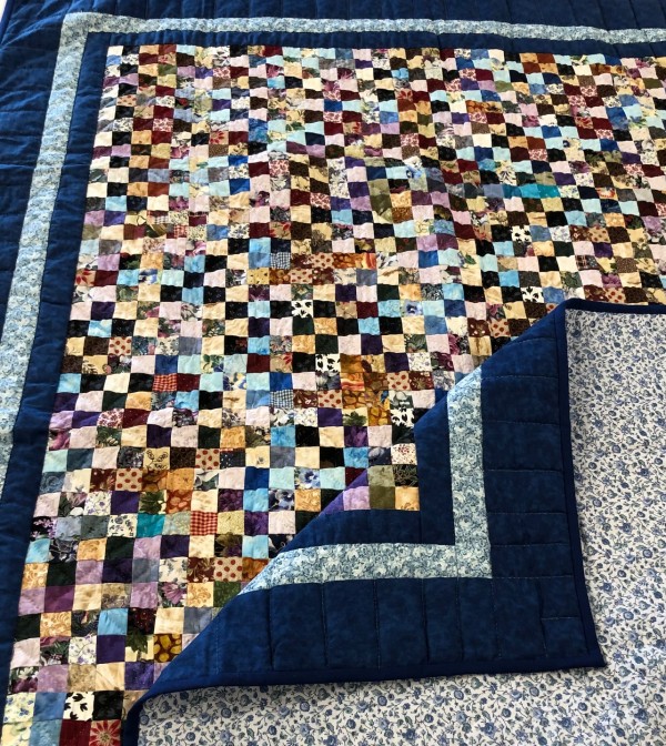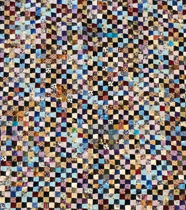 Hundreds of small postage stamp-sized pieces all work together in this stunning quilt! The quilt-maker's artful placement of color creates a visually pleasing design.