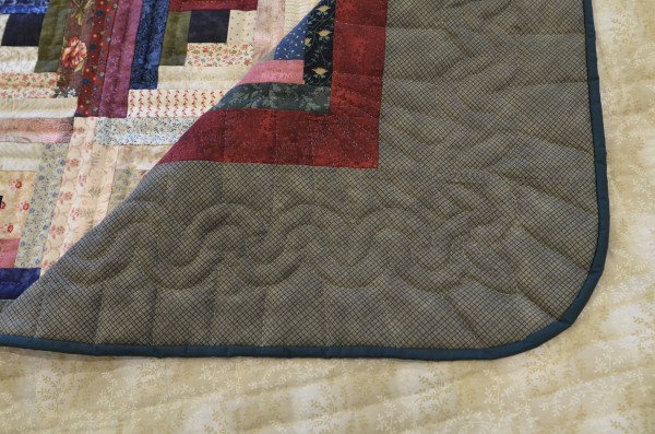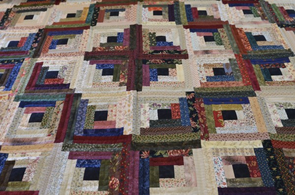 This charming Log Cabin quilt evokes memories of days gone by when quilts had many different scraps of fabrics in them. Each "log" is accented with neat quilting giving the quilt added loft and beauty. The framing border also features hand-quilting with clean, vertical lines. A cozy bed covering, this traditional pattern will quickly become a treasured family heirloom. Hand-quilted by a Mennonite friend, Lancaster County, PA.