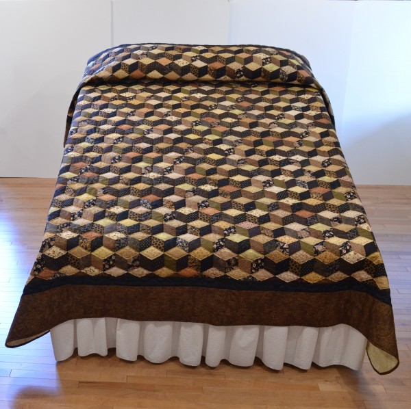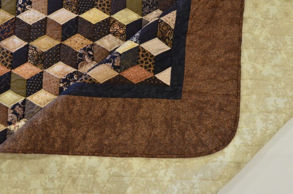 The expert shading in this quilt creates a 3-dimensional effect and the illusion of blocks falling across the bed. The Tumbling Block pattern can only be done well by an experienced seamstress, and the piecing of this traditional design is very precise. Each diamond has discreet hand-quilting all the way around, adding loft and dimension to the design. Hand-quilted by a Mennonite friend, Lancaster County, PA.