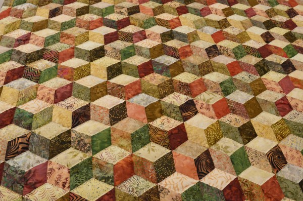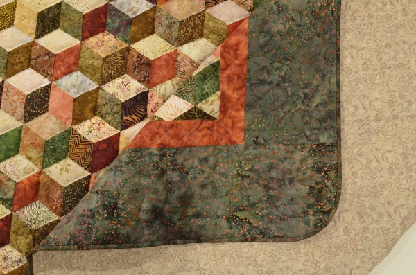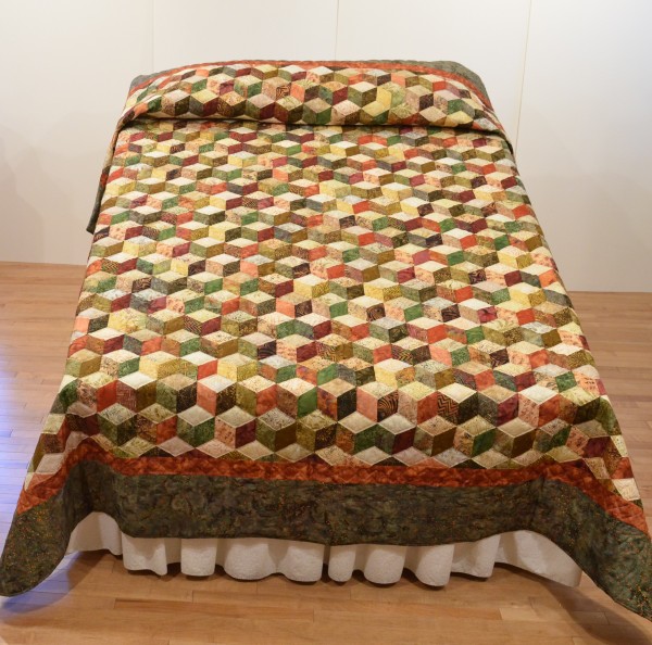 The expert shading in this quilt creates a 3-dimensional effect and the illusion of blocks falling across the bed. The Tumbling Block pattern can only be done well by an experienced seamstress, and the piecing of this traditional design is very precise. Each diamond has discreet hand-quilting all the way around, adding loft and dimension to the design. Hand-quilted by an Amish friend, Lancaster County, PA.