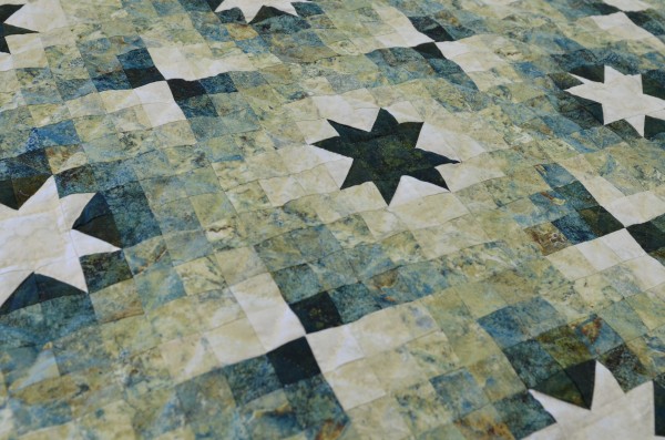 A traditional star block is centered amidst small blocks of color, forming larger blocks that make up the overall design of the Dancing Stars quilt.