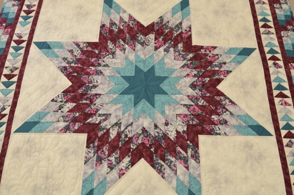 Here's an attractive variation of the Lone Star quilt design. This smaller star is contained within a Flying Geese border and a pieced block border.